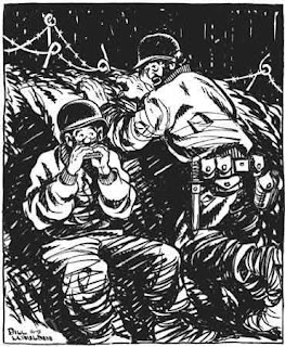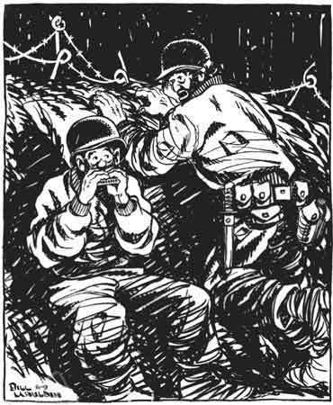 | "The krauts ain't following ya too good on 'Lili Marlene' tonight, Joe. Think somethin' happened to their tenor?" Cartoon by Bill Mauldin |